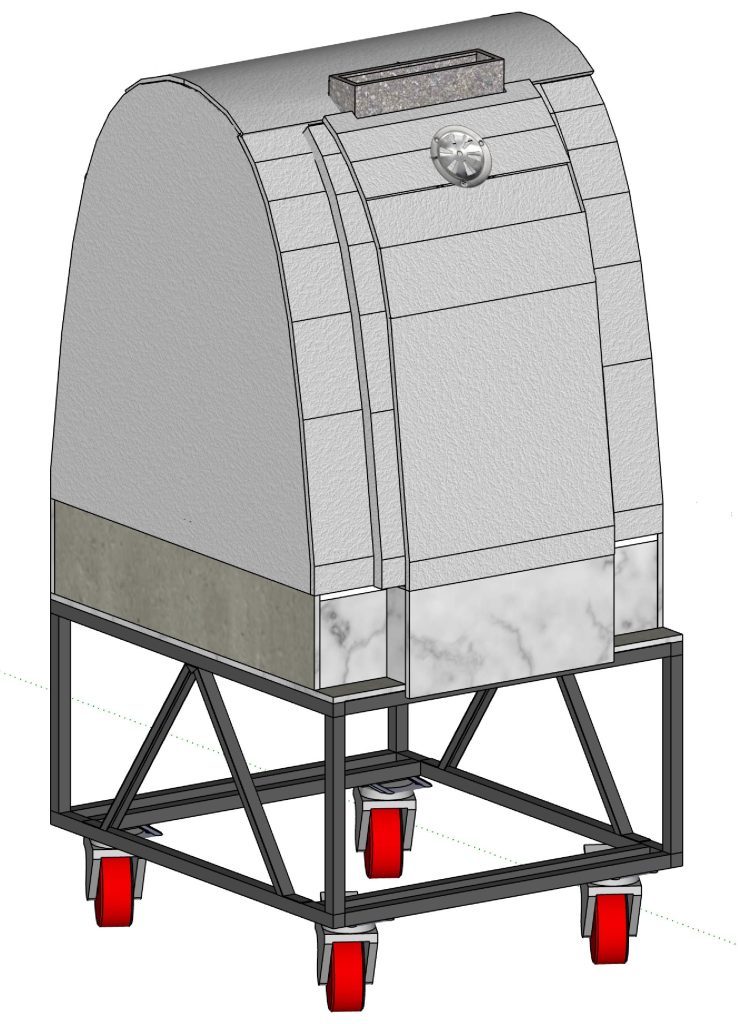 The main structure is a catenary arch form cast in sections using a multi-layer sandwich consisting of ceramic fibre blanket with a hard refractory hot face and an ultralight concrete outer face. It is built on a mobile steel base, but the catenary arch requires no further bracing as it is an inherently stable form. Width is minimised to allow reasonable manoeuvrability, and there is good access for loading through a full sized front door opening.